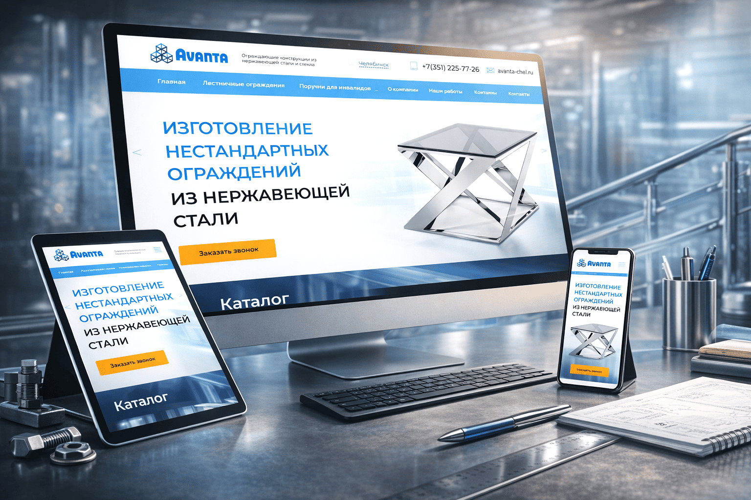 Первый экран строительной компании AVANTA сразу задает деловой контекст: чистый фон, строгая сетка, объект сложной геометрии в фокусе, никакой декоративной пыли. Клиент мгновенно понимает специализацию фирмы и уровень инженерной культуры, что повышает доверие в сегменте индивидуальных металлоконструкций на 17–23 % и напрямую влияет на готовность обсуждать проект с высокой стоимостью.